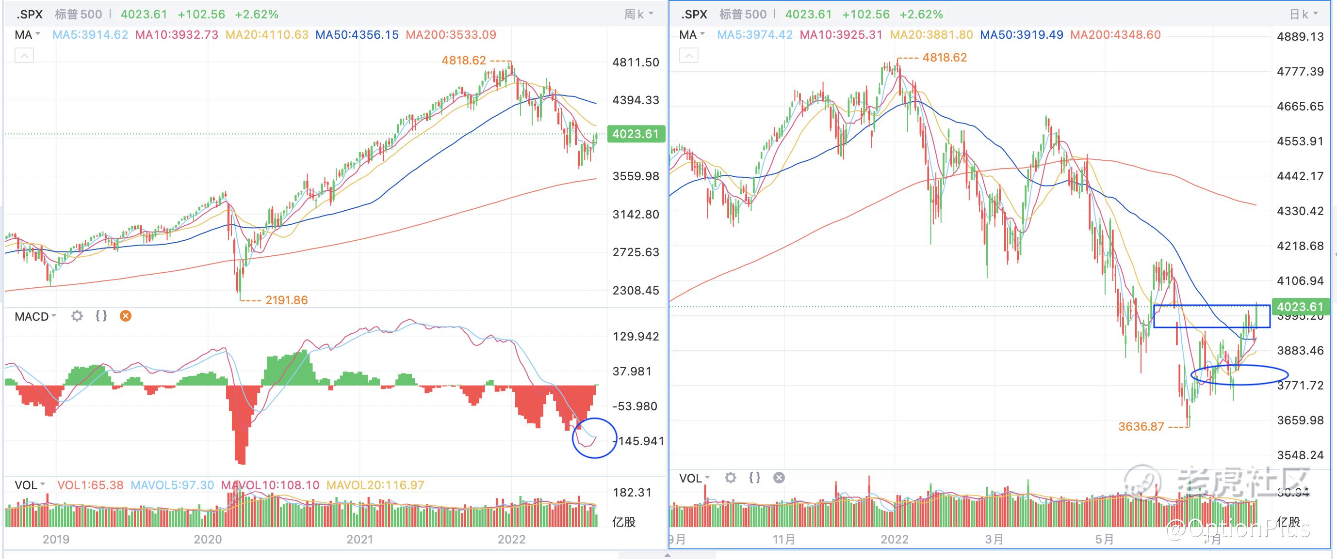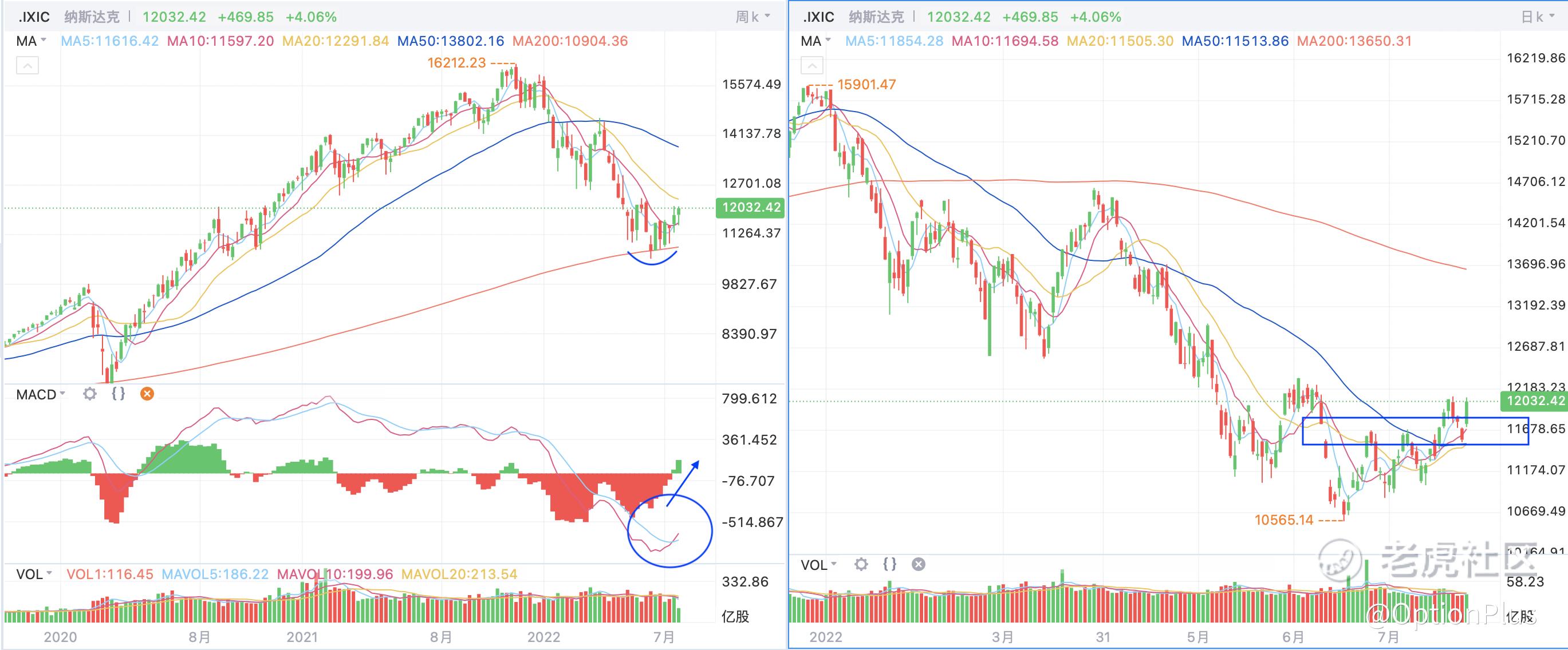 看看图形,风险偏好较高的纳斯达克率先走出行情。从日线基本看,6月暴跌两个缺口中上面那个已经在上周先回补了,回补后三天回踩昨天再涨比较稳。再看周线,MACD上周出现金叉,本周确认趋势,我会认为周级别的信号通常会比较扎实,200周线上盘整了4-5周,做底很明显。标普指数反弹不如纳指,当然它前并没有完成200周均线的回调。周MACD昨天晚上正式形成金叉,这个叉我等了一周了,还是拖到议息落地,说明市场还是稳健。日线上,也是昨晚正式补回高一点的缺口。下方也留下一个小型缺口在3780-3800左右。介于下一次会议在9月,给多头的时间比较充裕,我个人再后面几周是偏乐观的,可能有扰动但不会影响大的反弹行情。至于市场是不是转牛了,我一如既往的看周50线的,只有站上去才算牛市。