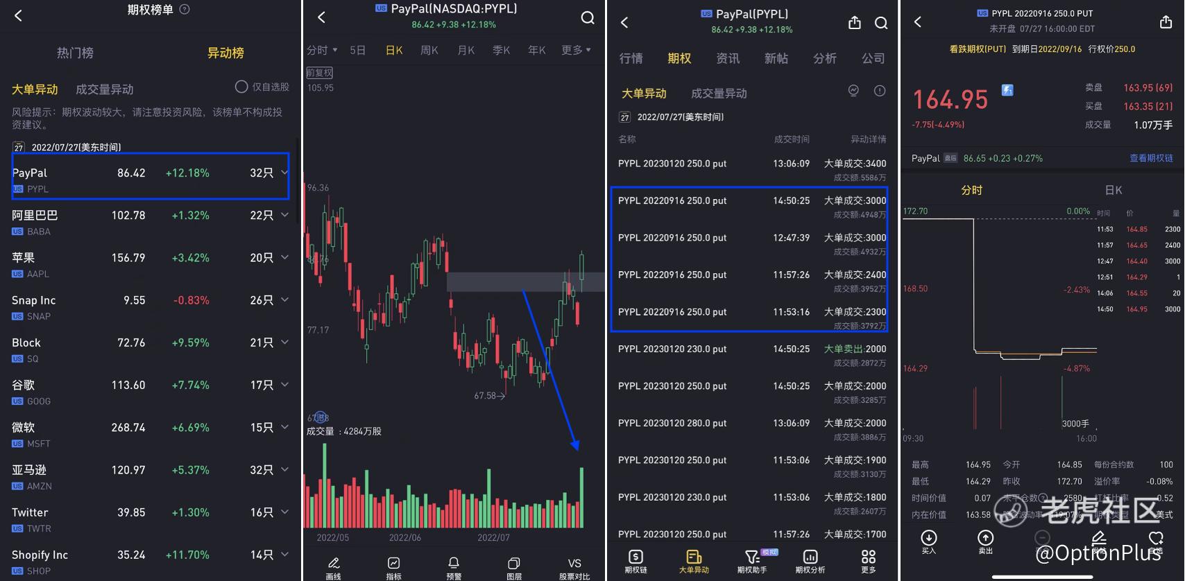 说一个期权异动观察,我很喜欢看期权异动榜,昨晚一个$PayPal(PYPL)$ 不但正股成交量异动,且期权出现非常深度Put的异动。PYPL 20220916到期的行权价为$250的PUT昨晚成交了1.07万张合约,按照昨晚的收盘价,大概有小2亿美元的成交量,另外还有比如20230120$250的合约成交1.5亿刀左右,PYPL过去一个月的价格维持在70-80之间,但这个PUT行权价高达$250,我查阅了916到期的这张合约未平仓仅剩下2580张合约,因此这里大部分的成交都是平仓。我大致猜测过去某个时候的当PYPL股价还在200-300的时候,有人买了大量的远期PUT,昨晚止盈平仓,而PYPL昨晚股价因逼空涨了12%。不止PYPL,细看$Shopify Inc(SHOP)$ 期权异动也有同样的情况,昨天SHOP的财报不及预期,先跌后涨,可能是由于部分空头止盈带来的逼空。