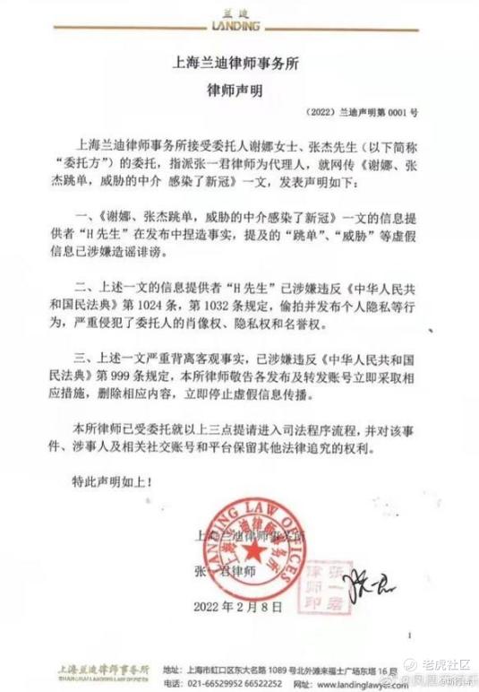 2月8日下午,谢娜张杰方律师发表声明,H先生发文提及的“跳单”“威胁”等信息均为虚假不实信息,涉嫌造谣诽谤;其偷拍并发布个人隐私等行为,严重侵犯了当事人的合法权益。声明还表示,律师已受委托提请进入司法流程,并对该事件、涉事人及相关社交账号和平台保留其他法律追究的权利。