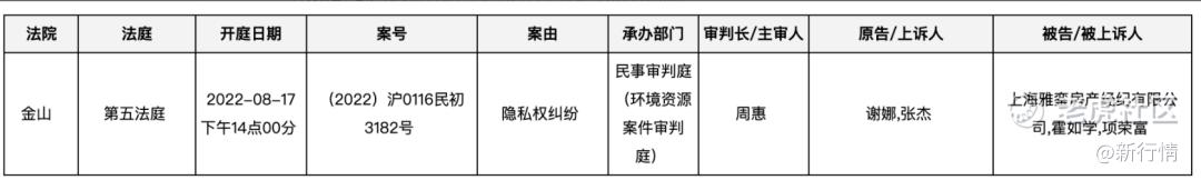 上海市高级人民法院网站显示,张杰、谢娜与上海雅銮房产经纪有限公司等的名誉权纠纷案将于2022年8月17日下午15点15分在上海市金山区人民法院第五法庭开庭,案号为(2022)沪0116民初3212号。