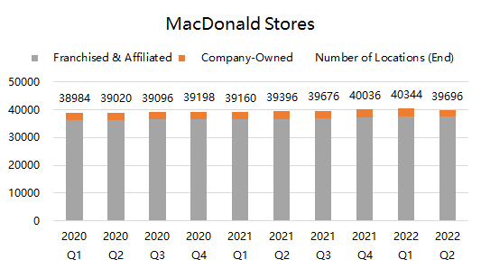- 截止Q2的总运营店面有3.96万家,关闭的802家主要是俄罗斯的直营店面。同时,在中国的店面有4727家。