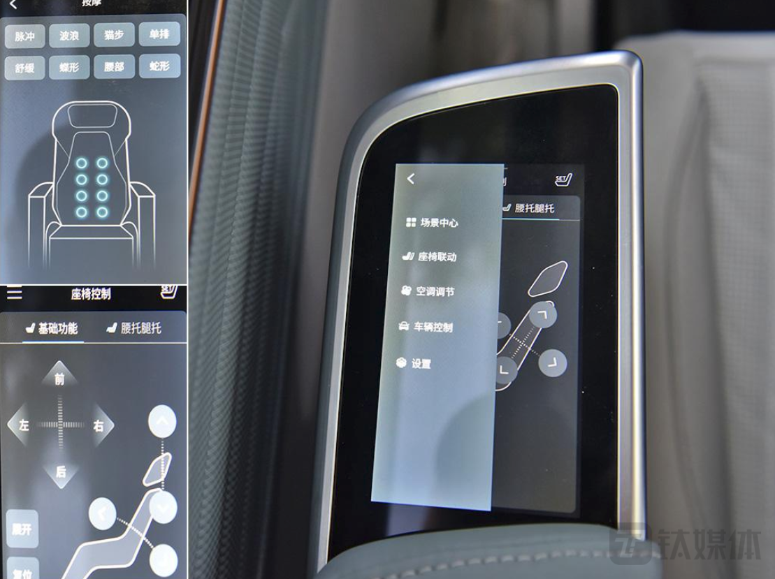 座椅在配置上可以说相当丰富,细节也考虑的较为周到。第二排座椅都可以打开扶手上的滑盖,里面是触控显示屏,和刚刚发布的全新宝马7系有异曲同工之处,而且功能极其全面,包括前后、左右、腰部、头枕、腿托多向调节,还可以个性化设置一键直达,另外加热、通风等功能都有。