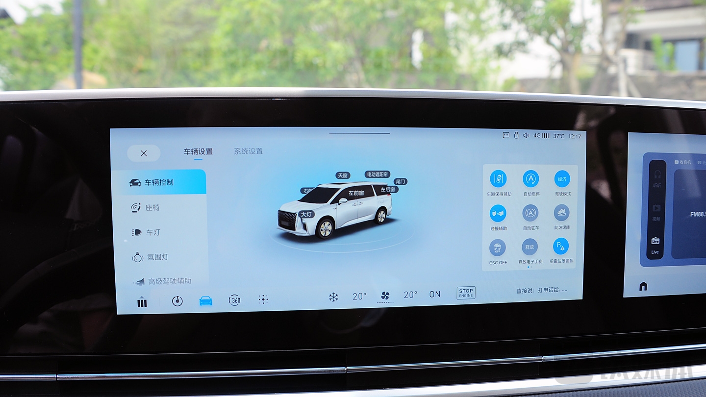 中间的多媒体屏幕为12.3英寸,搭载的是蜘蛛智联车联网系统,导航栏功能显示清晰,内容包括:导航、娱乐、车辆控制、全车影像、系统等,在应用上包括高德、钉钉、电视家等热门居家旅行必备软件都有覆盖。在操作逻辑上表现合理,可分屏与副驾驶屏幕实现互动,也可以和第二排屏幕互联。总之功能十分强大,要玩明白需要一段时间,并且会不断发现一些小惊喜。