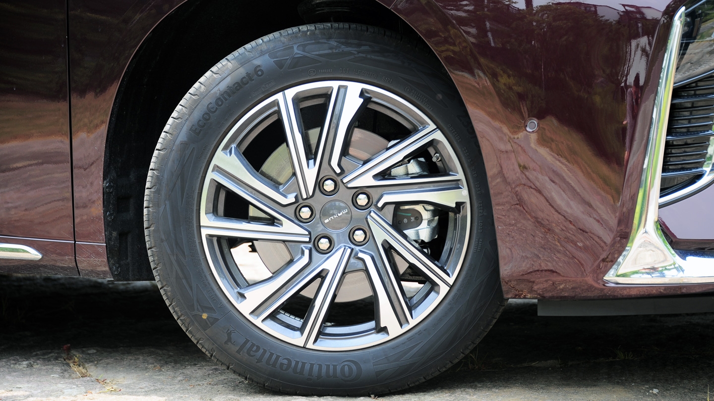 高配版车型配备了马牌EcoContact 6系列的235/55 19R轮胎,在舒适性和静音上表现出色,五辐铝合金轮毂显得较为运动、年轻。