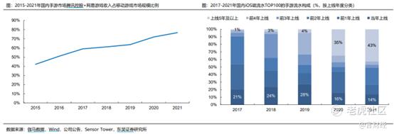 同时头部厂商市占率逐步提升,存量市场里,新游戏的竞争格外激烈。网易和腾讯两个巨头二者的市占率在2021年已经达到了解禁80%,21年国内IOS端流top100的手游里,上线5年及以上的游戏占了整体流水的43%,而且趋势在逐步提高,主要是王者荣耀、吃鸡、梦幻西游等长线游戏所导致。