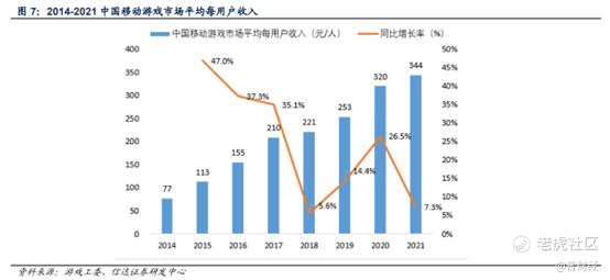 手游用户在21年仅增长了200万人,同比增速为0.23%,总用户数到达了6.56亿,考虑到用户年龄分布的问题,该用户数在短期内基本已经到达了天花板。当然随着代际的更迭,越来越多人会成为互联网原住民因此游戏用户数量肯定会继续提升,这是未来10-20年的大故事,就另当别论了。