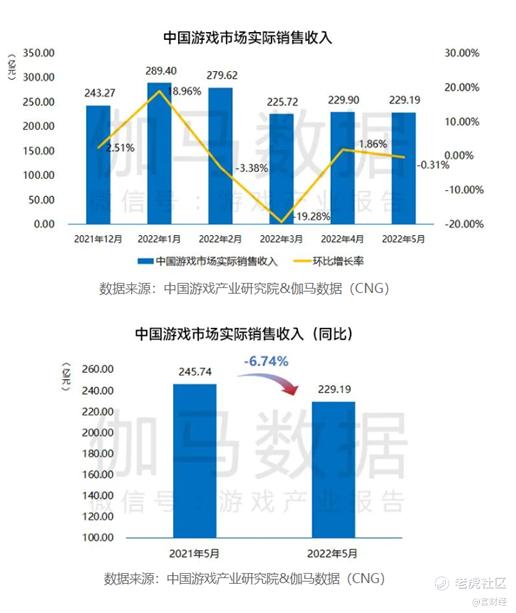 5月份中国游戏市场实际销售收入已经是连续第三个月同比下滑了,5月份下降了6.74%至229.19亿元。其中主要下滑来自于手游市场,同比下滑10.85%,至169.96亿元。两个原因: