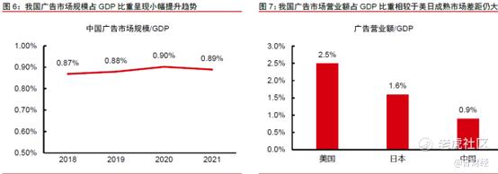 然而我们也需要看到一点就是,互联网广告的渗透率还是在不断提升,而且广告大盘也有增长空间。因为目前广告行业TAM/中国GDP的比值只有0.89%(2021年),美国为2.5%,日本为1.6%