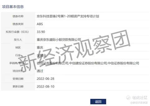 深交所官网则显示,8月10日,《京东科技荟臻2号第1-20期资产支持专项计划》已被通过,拟发行金额为33.9亿元,发行人为重庆京东盛际小额贷款有限公司(以下简称“京东盛际小贷”)。受理日期为6月28日,承销商有首创证券、中信建投、中信证券。