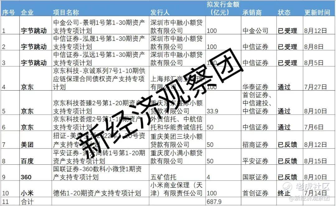 新经济观察团不完全不统计发现,近一个月来,字节跳动、京东、美团、百度、360旗下小贷、保理等公司发行的ABS项目获得上交所或深交所的受理、反馈及通过,但小米旗下保理公司的一个百亿项目被终止。从发行量上来看,六家公司合计涉及10单ABS ,总金额687.9亿元,其中字节跳动以3单、300亿拔得头筹,京东科技则以3单、183.9亿元。具体来看: