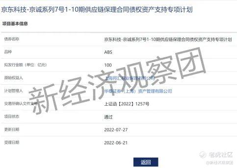 根据上交所官网,《京东科技-京诚系列7号1-10期供应链保理合同债权资产支持专项计划》获得通过。京东科技旗下的上海邦汇商业保理有限公司将成功发行100亿元ABS项目。受理日期为今年6月21日,通过日期为7月27日,承销商为华泰证券。