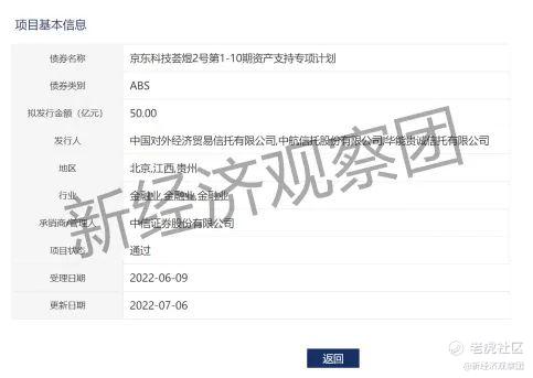 《京东科技荟煜2号第1-10期资产支持专项计划》在6月9日受理后,7月6日就获得通过。该项目拟发行金额50亿元,发行人为外贸信托、中航信托和华能贵诚信托,承销商为中信证券。