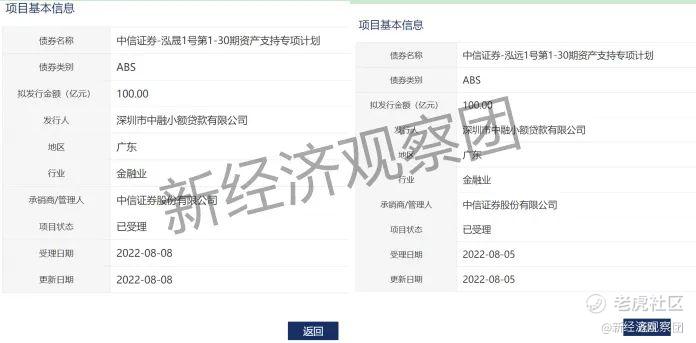 同时,深交所官网则显示,由中信证券承销的中融小贷两个ABS产品已在8月8号和8月5号被受理。产品名称分别为《中信证券-泓晟1号第1-30期资产支持专项计划》和《中信证券-泓远1号第1-30期资产支持专项计划》,拟发行金额均为100亿元,合计200亿元。
