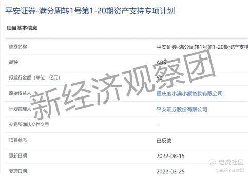 百度也不例外。8月15日,重庆度小满小额贷款有限公司以下简称(“度小满小贷”)拟发行的50亿元ABS显示“已反馈”状态。该计划名为《平安证券-满分周转1号第1-20期资产支持专项计划》,承销商为平安证券。