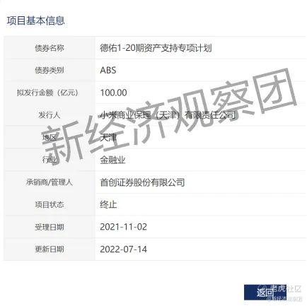 几家欢喜几家愁。不同于上述互联网同行,小米旗下小米商业保理(天津)有限责任公司(以下简称“小米商业保理”)一单ABS被终止发行。深交所网站显示,《德佑1-20期资产支持专项计划》承销商为首创证券,拟发行金额为100亿元,受理日期为2021年11月2日,2022年7月14日被终止发行。