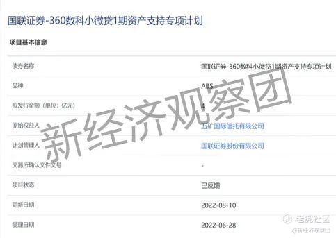 8月10日, 《国联证券-360数科小微贷1期资产支持专项计划》项目状态更新为“已反馈”,项目受理日期为2022年6月28日。发行人为五矿信托,承销商为国联证券。
