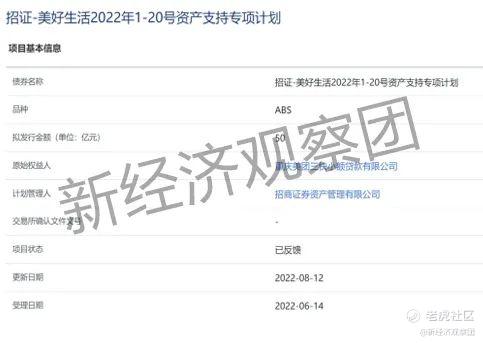 除了字节跳动,其他互联网公司也在密集发行ABS。8月12日,重庆美团三块小额贷款有限公司(以下简称“美团小贷”)拟发行的50亿元ABS显示“已反馈”状态。该项目名称为《招证-美好生活2022年1-20号资产支持专项计划》,被上交所受理的时间是今年6月14日,由招商证券承销。