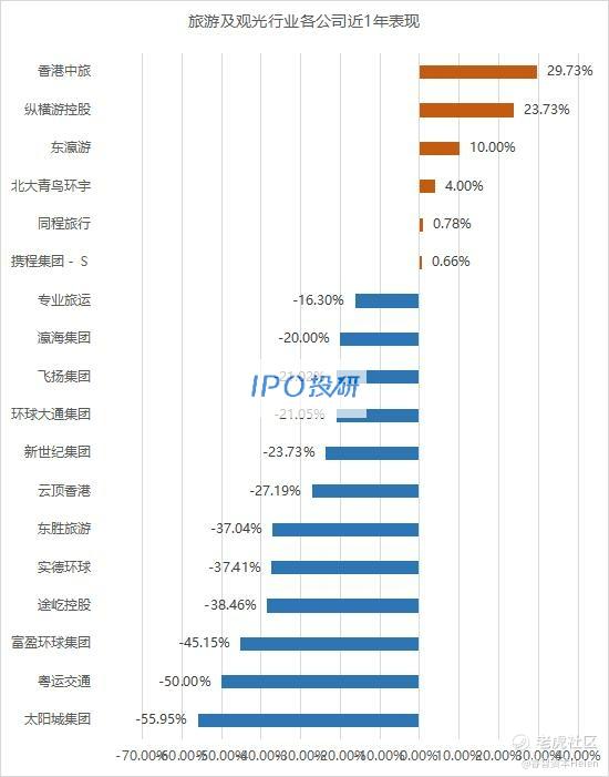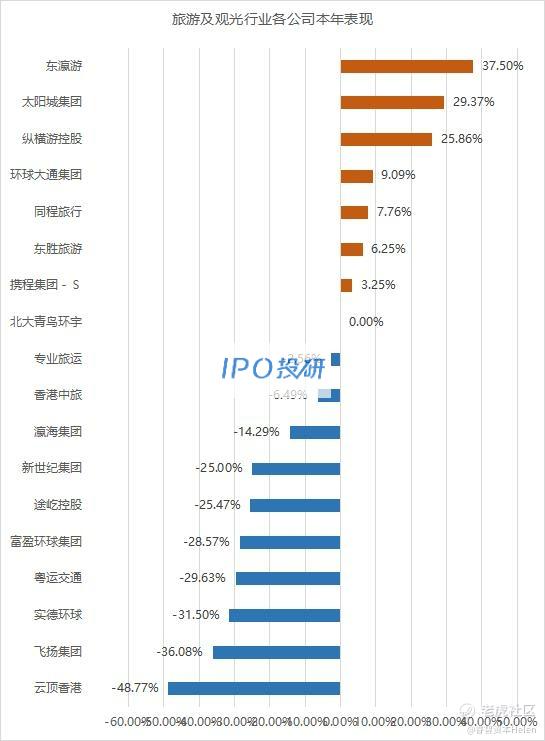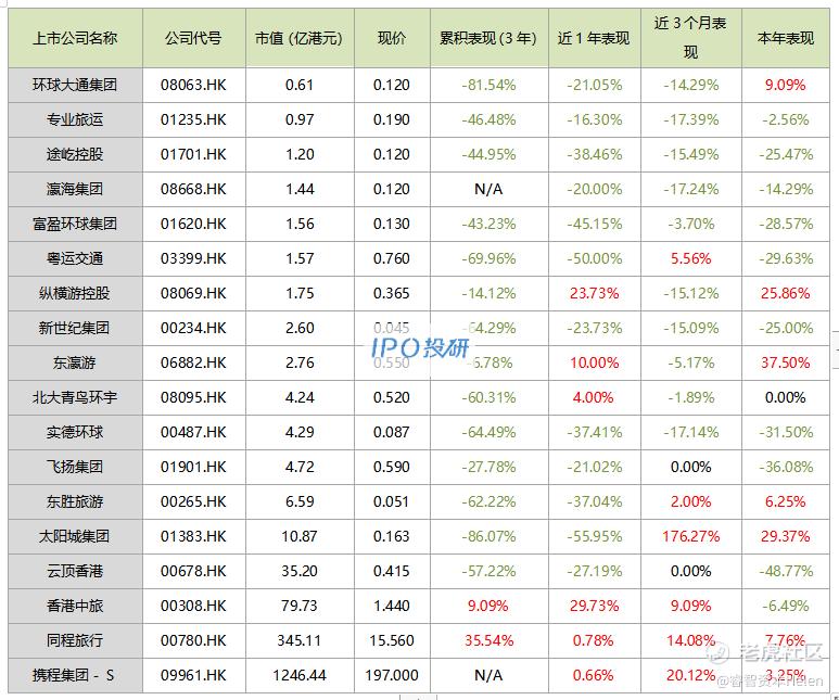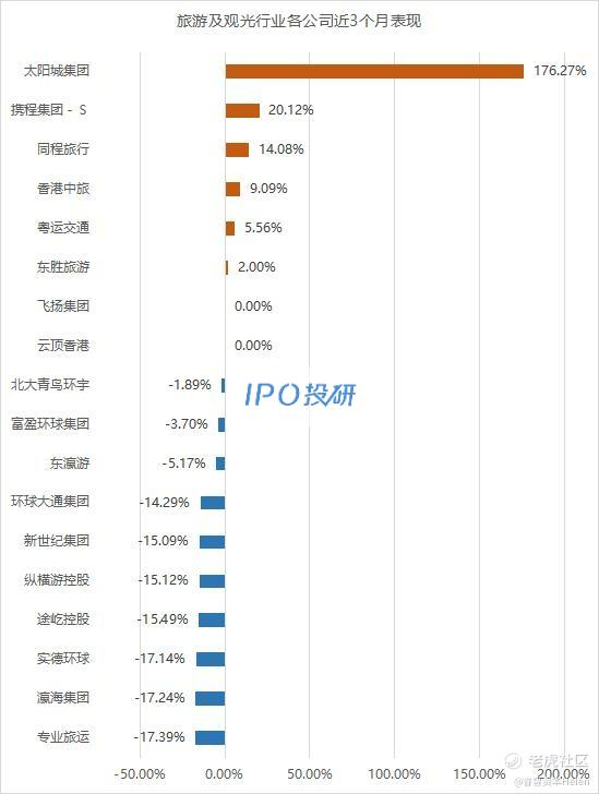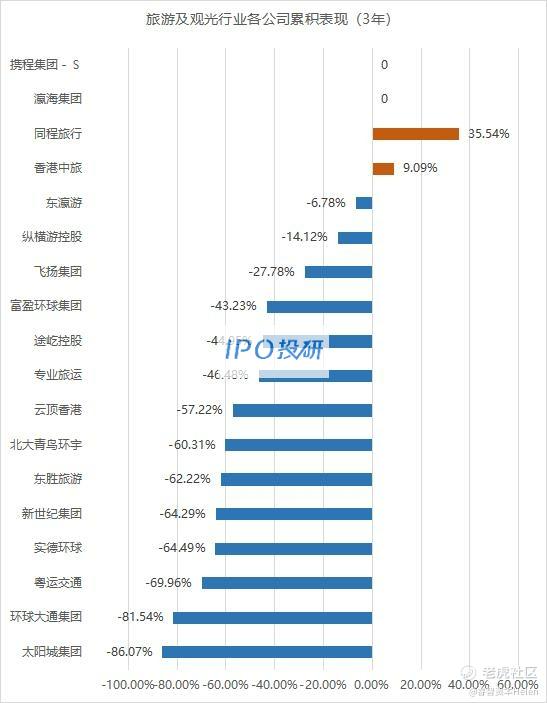 累计表现涨幅最大的是同程旅行(00780.HK),涨幅为35.54%;跌幅最大的是太阳城集团(01383.HK),跌幅为-86.07%。