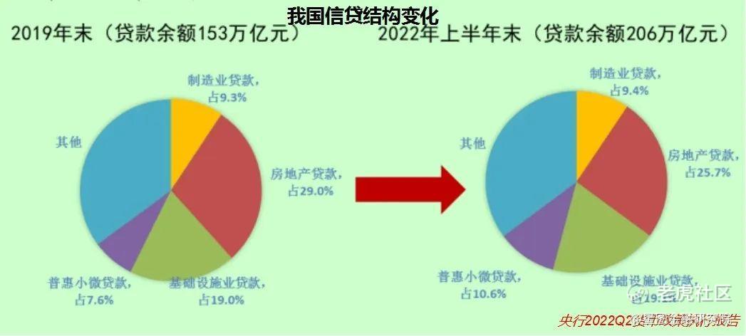 据央行2022Q2货币政策报告,2022年6月末206万亿元人民币贷款余额中,普惠小微、制造业、基建、房地产贷款大体占全部贷款余额的一成、一成、两成、两成半,其中,房地产贷款占比持续下降,普惠小微贷款占比稳步抬升。