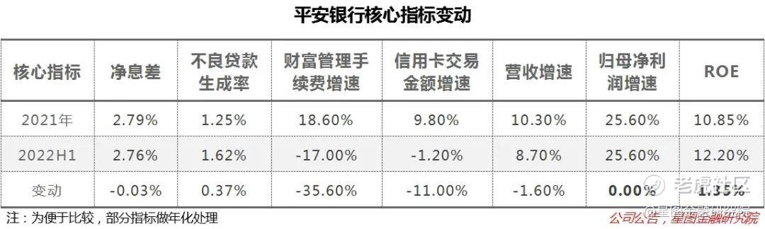 具体来看,2022年上半年,平安银行净息差收窄3个BP,不良贷款生成率(还原不良核销后的不良贷款生成额/期初贷款余额)抬升0.37个百分点,财富管理手续费从大幅增长变为同比负增17%,信用卡交易金额出现负增长,营收增速下降1.6个百分点。