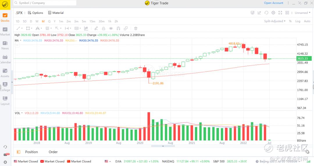 2022年6月美国股市强烈震荡,整体下跌。月底标普500指数收盘3,785点,大跌8%,月中(6月17日)探底接近3600点。