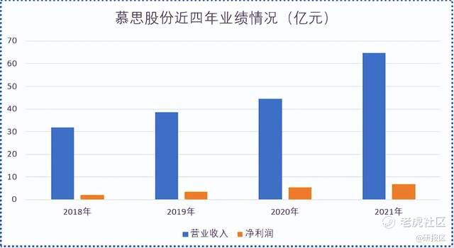 2018-2021年,慕思股份分别实现营业收入31.88亿元、38.62亿元、44.52亿元和64.81亿元;同期归母净利润分别为2.16亿元、3.33亿元、5.36亿元和6.86亿元。