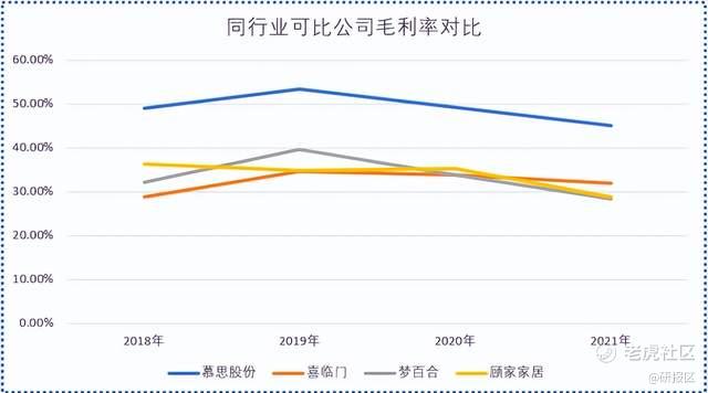 2018-2021年,慕思股份的毛利率水平分别为49.14%、53.49%、49.28%以及44.98%,公司的毛利率水平已经连续三年下滑,且降速逐渐增大,不过相比整体制造业水平以及一众同行,公司的毛利率水平仍然算很高的。