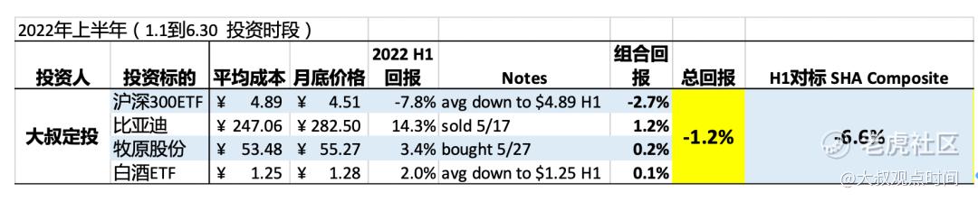 操作结果——除了沪深300有账面亏损(亏 -7.8%),其他都是盈利的(从2%到14%不等),但是因为沪深300的比重最大,在上半年约50%的仓位中,占投入比例的34%,所以组合是亏损的,账面亏损约 -2.2%。