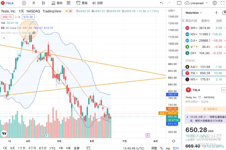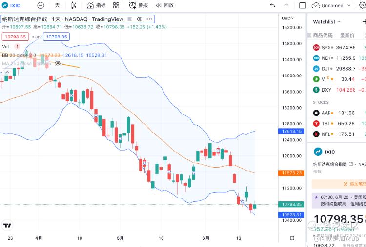下图是纳斯达克指数今年的周线走势图,在年初第一周纳指跌破布林线中轨以后,之后都没再有效站上这个位置,中间有过突破,但是最终都下去了。