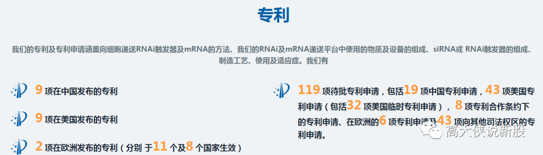 截至最后实际可行日期,我们拥有合共六项已发行专利,包括欧洲一项及美国五项以及涵盖递送平台以外16种候选产品的40项待批专利申请(包括中国七项、美国21项、欧洲一项、专利合作条约下两项以及其他司法权区九项)。