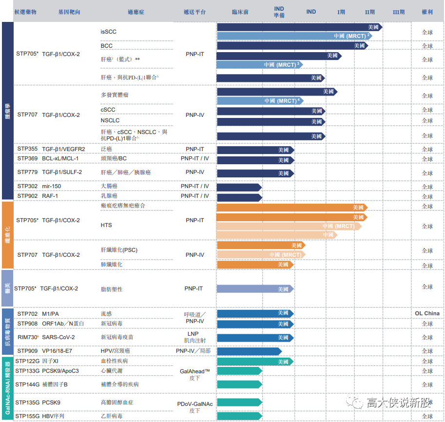 业务板块主要专注于肿瘤学及纤维化产品,以及抗病毒产品及利用肝脏靶向给药的产品。目前已经自主开发并拥有主要候选产品STP705及STP707的全球权利,这表明有能力基于专有的递送平台设计新型RNA疗法,并将其开发成药物以满足医疗需求。