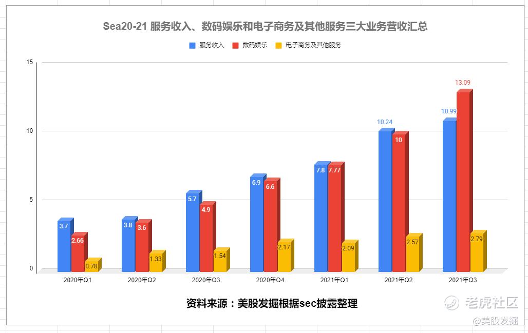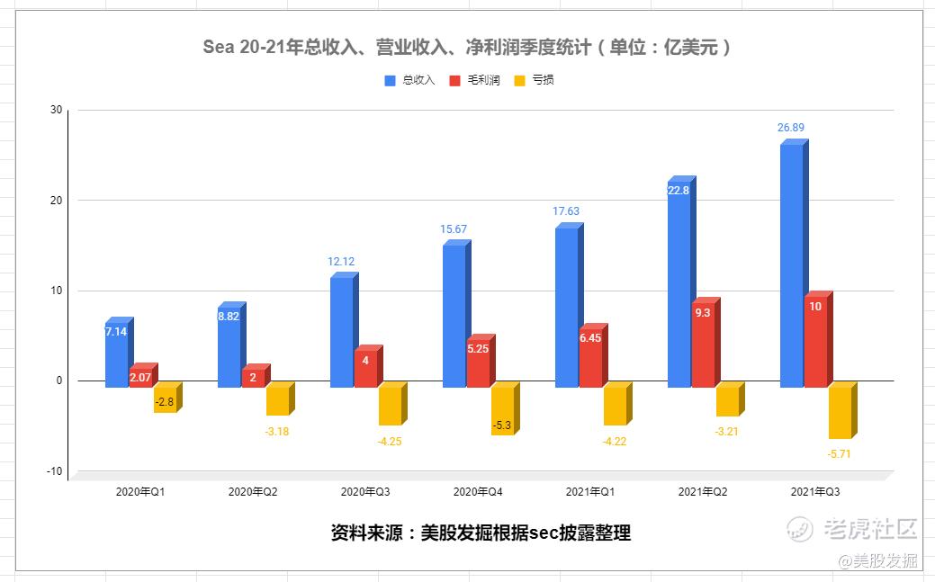 进入2021年,Sea第一到三季度、总营收分别为17.6亿、22.8亿、26.89亿美元,同比增长146.7%、158.6%、121.8%。亏损分别为4.22亿、3.21亿、5.71亿。进入2021年营收飞速增长,亏损趋于稳定。