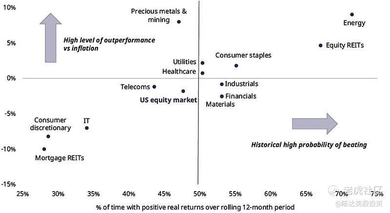 (来源同上,各行业的股价表现,横轴是历史上能跑赢通胀的几率,纵轴是回报表现)