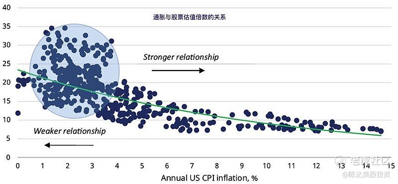 从上图也可以看到,当通胀在3%-4%以下,通胀与股票整体估值倍数的关系,所谓的散点图(scatter plot)就跟散弹枪开的一样,完全没啥规律可言;但是如果超过了4%,到一个比较高的水平,虽不能说完全呈线性关系,但基本上可以看出高通胀会带来低估值。
