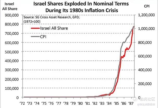(以色列股市股价(红线)与以色列通货膨胀(灰线)在80年代超级通胀时的表现,来源:SG Cross Asset Research)