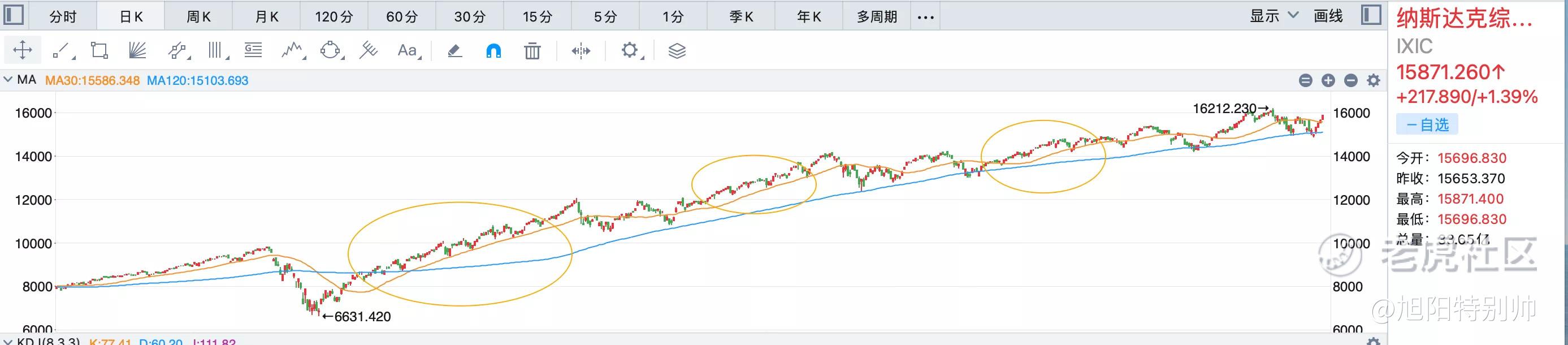 美股由于拥有做空机制,所以整体基调就是缓涨、快跌,并且大部分时间走势特别有规律,基本岁月静好的时间段里,总体沿着120日均线上扬,期间围绕着30日均线上下震荡,直接操作QQQ期权也能获利颇丰。
