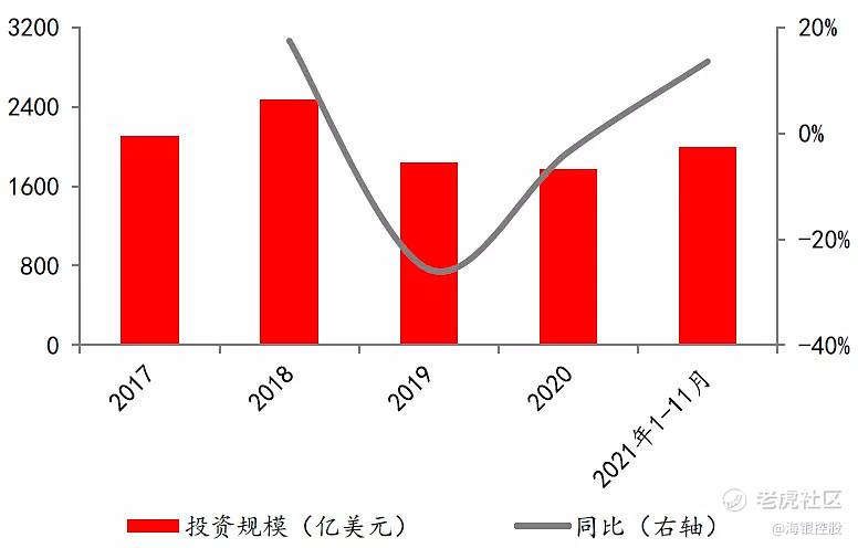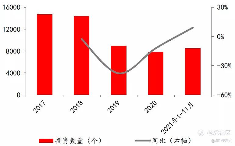 2、私募投资市场规模同比走高。2021年1-11月份中国VC/PE市场投资数量8467起,同比增长9%。投资规模为1987亿美元,同比增长14%。近期IT及信息化、能源、汽车等领域由于国家政策持续落地,相关领域投资火热。