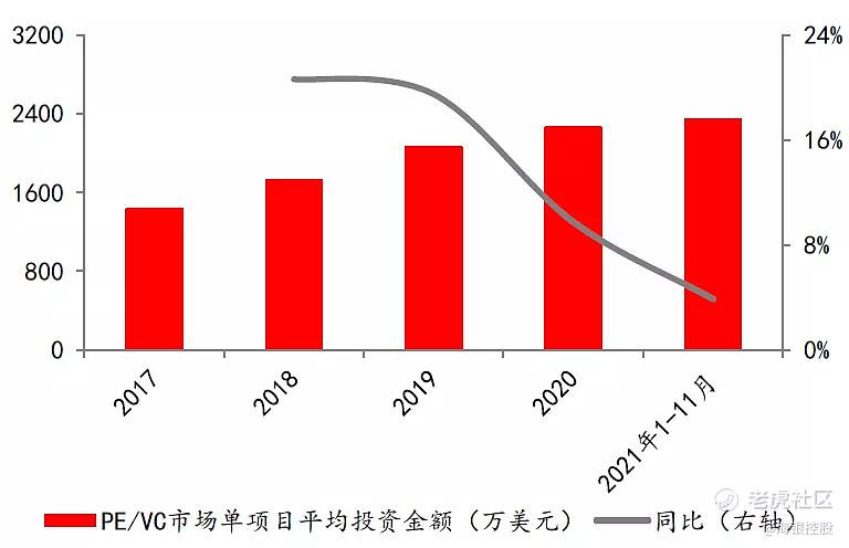 私募股权单项目平均投资金额维持高位震荡。2021年1-11月私募股权平均单笔交易规模为2347万美元,同比增长4%。整体大额融资项目大幅增加,资金聚焦在一线优质头部项目趋势仍在延续。
