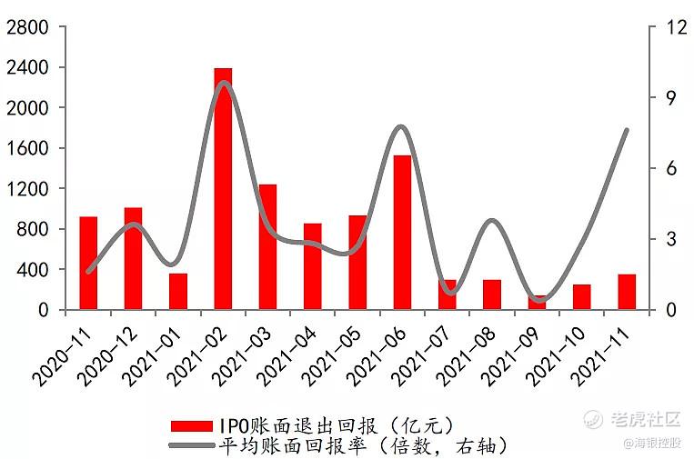 私募股权项目退出账面回报率回升。2021年11月,PE/VC机构退出账面回报达350亿元,行业退出回报率为7.61倍,相比上月呈现大幅上升。部分科创板和创业板公司上市估值较高,贡献了较高的退出回报率。