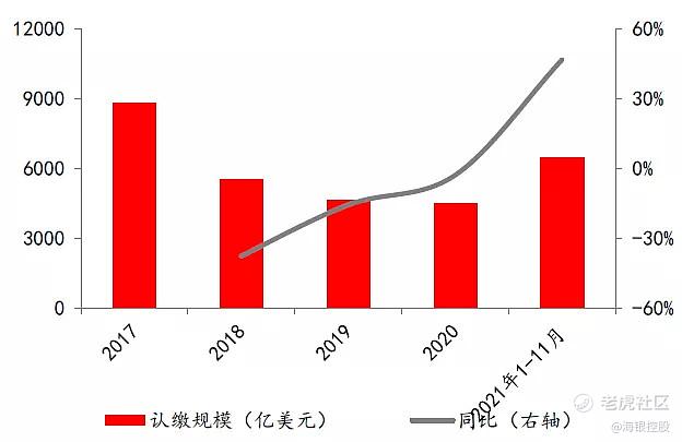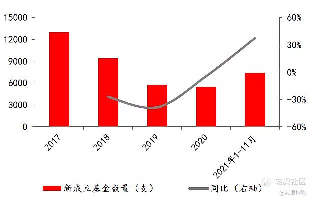 在2021年由于我国对疫情实现了有效控制,经济整体呈现良好恢复态势,私募股权募资在2021年募资形式亦呈现持续回暖态势。据投中数据显示,2021年1-11月我国私募股权新成立基金数量为7358只,同比增长(按年化加权)37%。同期我国私募股权认缴规模为6458亿美元,同比增长(按年化加权)47%。经济形势转好背景下,募资呈现全面提速。