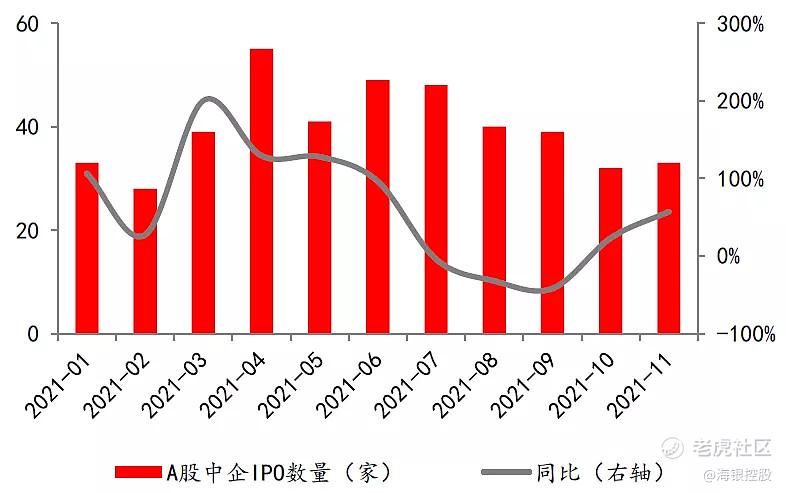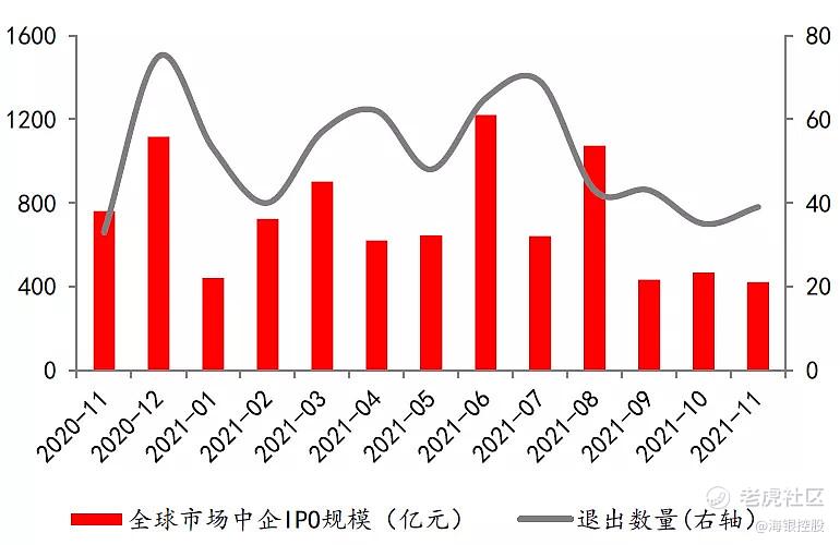 3、中国企业全球IPO数量平稳增长。据wind数据,2021年11月,中国企业在全球共有39家企业成功实现IPO, IPO数量同比上升18%,IPO募集资金421亿元同比下滑45%。在国内疫情得到良好控制背景下,国内IPO发行保持稳定增长态势。