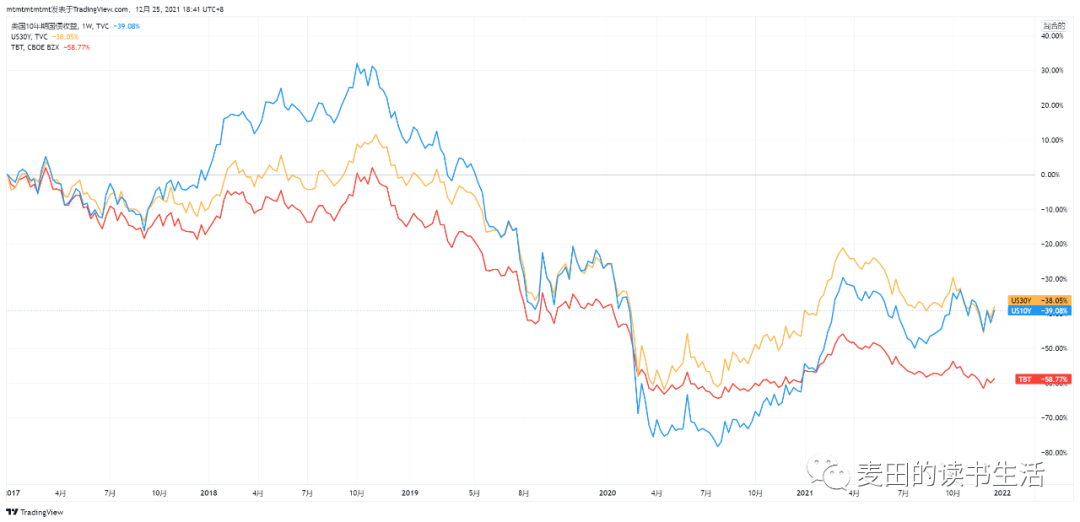有!不过不是个股,而是一个ETF,代码是:TBT。这个ETF是一个两倍的反向杠杆ETF,用于跟踪20年以上的国债收益。因为国债收益率是国债收益的倒数,所以TBT是以两倍杠杆跟踪美国长期国债收益率(20年+)。更进一步,由于20年+国债收益率基本上和10年国债收益率同方向变化,所以你可以理解TBT实际是以2倍的杠杆在跟踪一个最重要的经济指标:美国十年期国债收益率(US10Y)。简单的说就是us10y涨,tbt涨;反之亦然。如下截图,最近5年十年期国债收益率、三十年期国债收益和tbt同涨同跌的关系