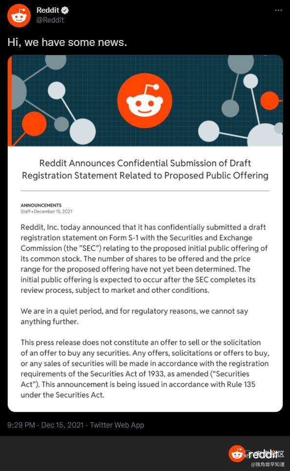 当地时间周三,以“美国散户大本营”著称、拥有WallStreetBets等知名论坛的社交媒体公司Reddit宣布,已向SEC秘密提交了IPO申请。发行股数和价格区间尚未确定。