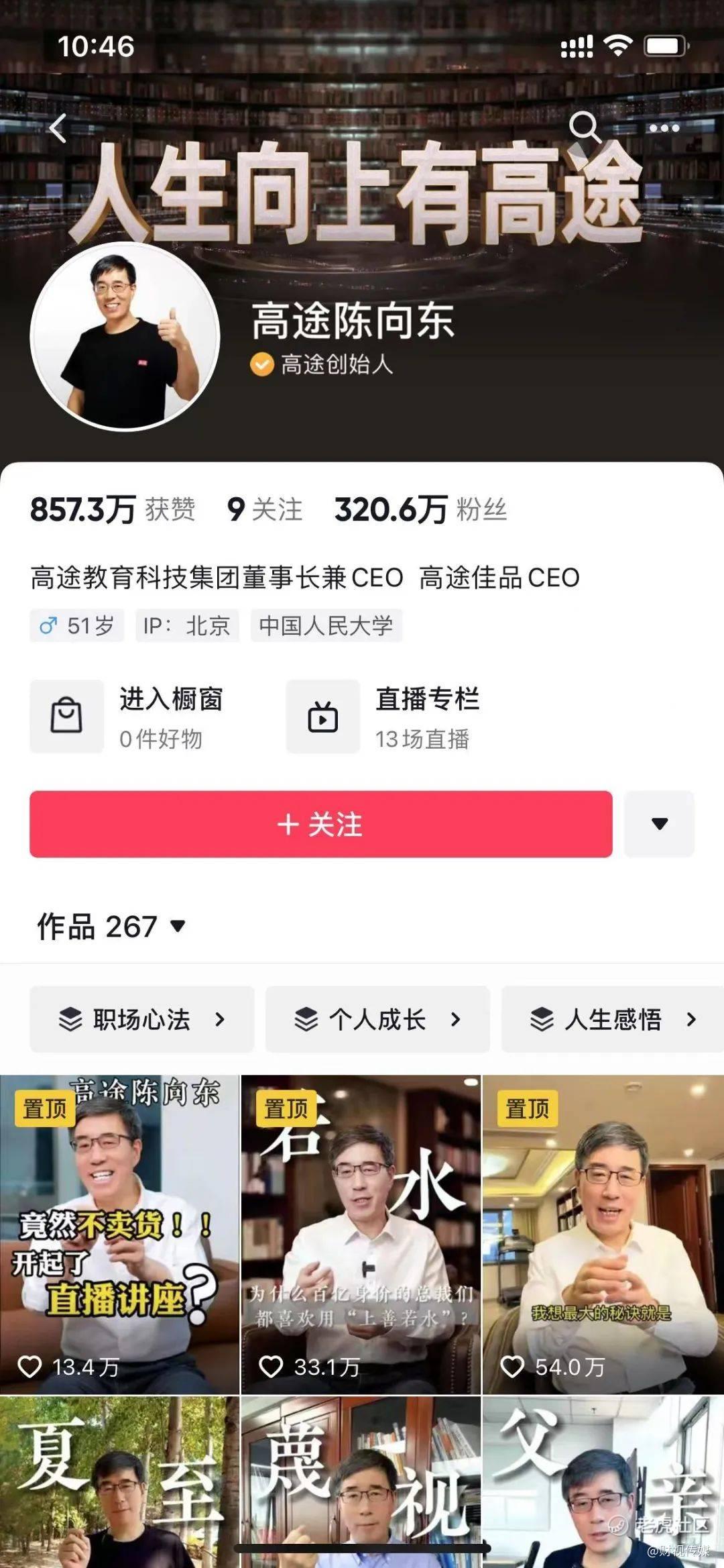 成立于2022年11月16日的高途佳品,自当年12月24日开始首播。陈向东自己的抖音号,则于2023年1月6日上线。截至6月20日,他的抖音号拥有粉丝320万、获赞857万。