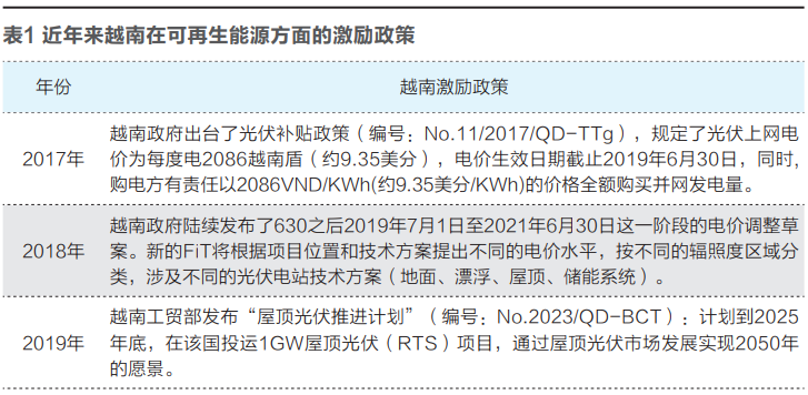 但是同为发展中国家,越南仅在9年内就缩小了这一差距。2019年越南太阳能发电装机容量激增至5.4GW,风电增加300MW。可以说,越南对于可再生能源的激励政策功不可没。表1具体列举了近年来越南在可再生能源方面的激励政策。