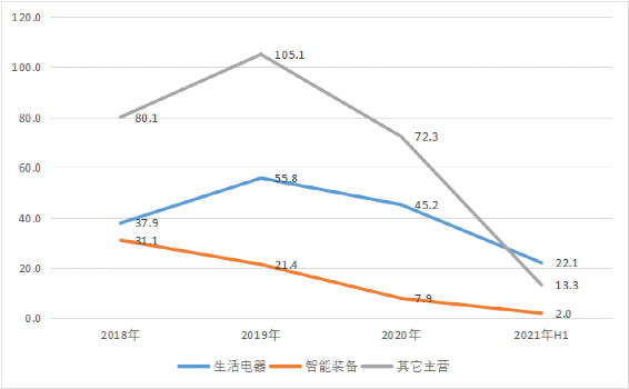 2021年上半年,格力的生活电器业务实现收入22.1亿元,同比下滑0.38%;智能装备业务实现收入2亿元,同比下滑5.44%。这已经是它们连续第三年下滑了。