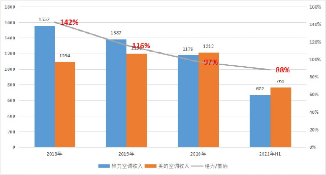财报显示,2021年上半年,格力空调板块收入672亿元,同比大增63%,但仍然低于2019年的793亿元。而美的在2021年上半年的暖通空调业务收入达764亿元。