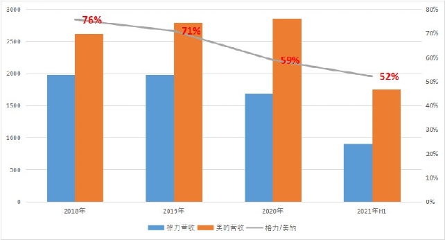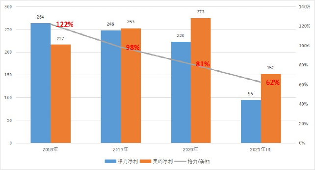 在2021年上半年,格力的净利润只相当于美的的62%,在短短三年前格力还领先于美的。