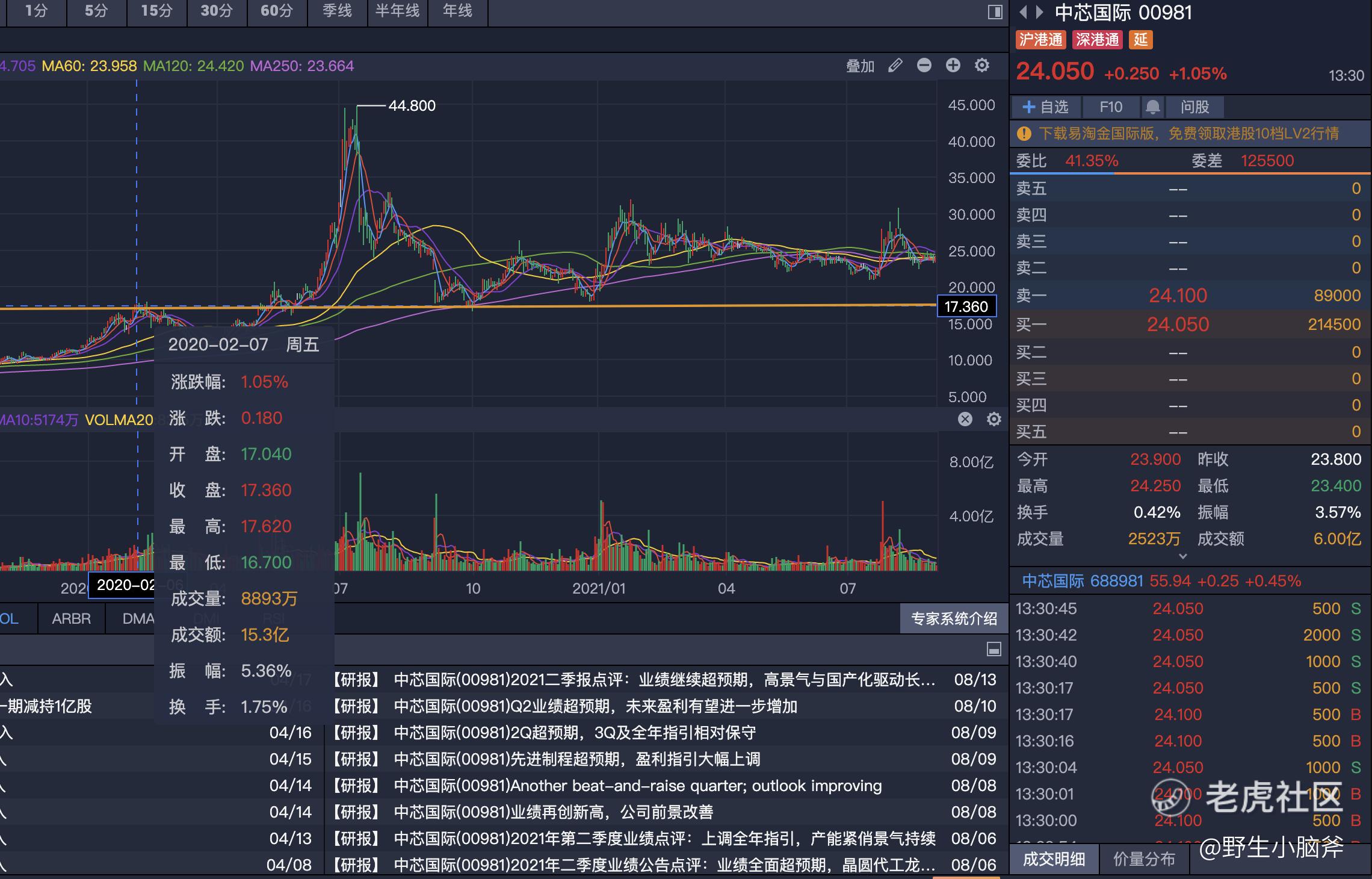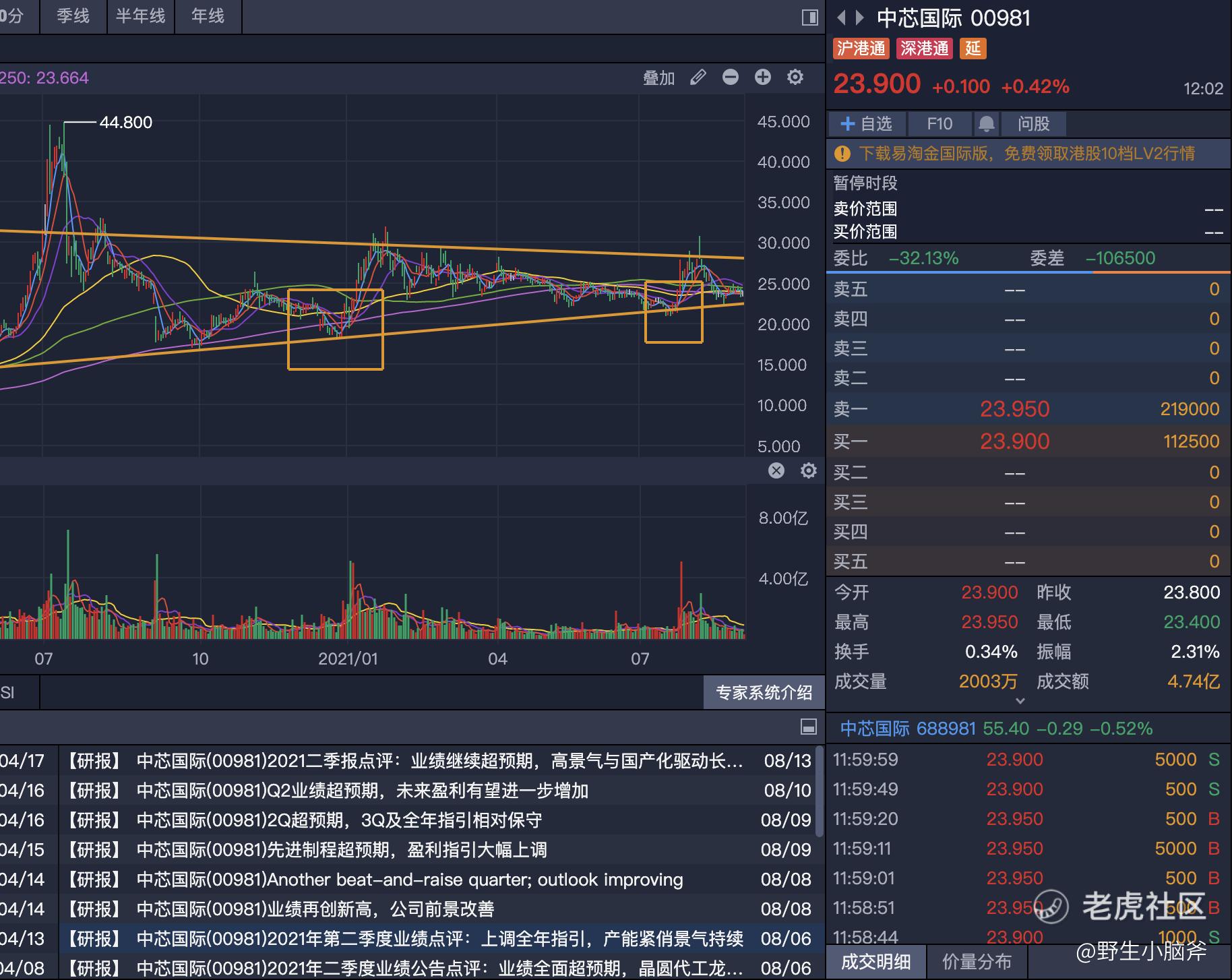 中芯国际在上海科创板上市以来港股股价便打到44港元的新高,但随之而来的是股价腰斩。自2020年7月以来,除了2020年底和2021年7月底的两波比较大的行情,其余时间该股走势都是在漫长的阴跌之中。虽然两波行情分别都有50%以上的涨幅,然而持有这样一支股票却是非常考验投资者的心性、耐心、决心和判断力。
