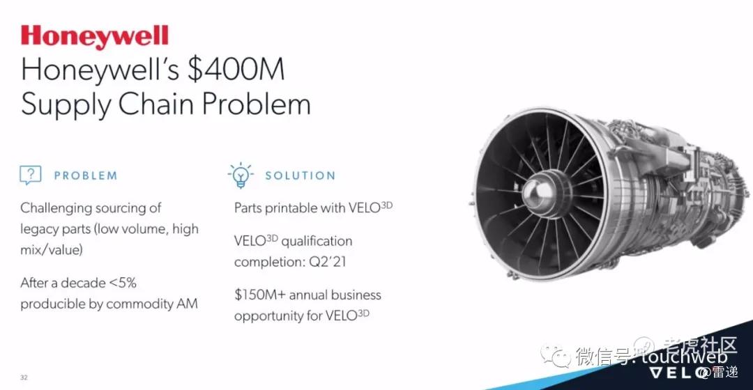 2020年初,Velo3D还宣布与霍尼韦尔航空航天公司建立合作伙伴关系,将旗下蓝宝石强化的金属3D打印机认证用于飞机零部件的生产。双方将利用霍尼韦尔航空航天公司在增材制造和飞机零件生产方面的丰富经验,来验证VELO3D的蓝宝石金属制造技术。